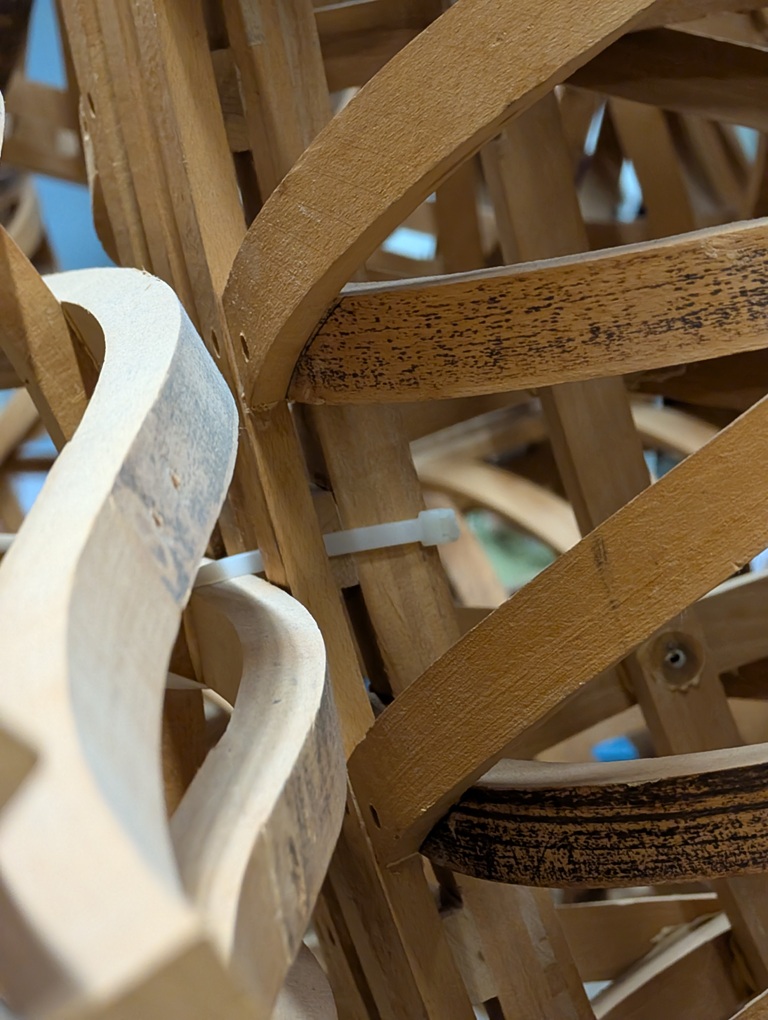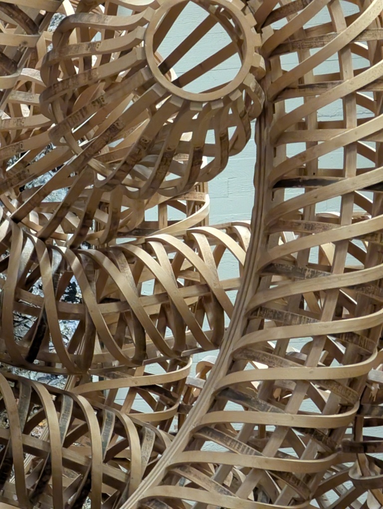 Die monumentale Plastik von Richard Deacon wurde anschließend ausführlich betrachtet und zeichnerisch erkundet. Die Schülerinnen und Schüler setzten sich mit den verwendeten Materialien (hier: Bugholz mit Klebstoff, Schrauben und Kabelbindern, 285x560x483cm), den organischen und geometrischen Formen sowie der räumlichen Wirkung der Arbeit auseinander. Besonders thematisiert wurde, wie Bewegung, Spannung und Dynamik in der Plastik sichtbar und körperlich erfahrbar werden.